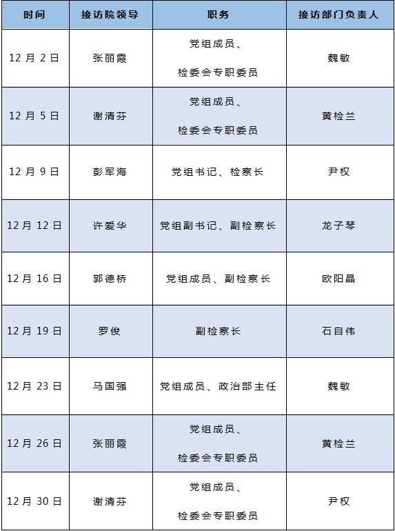 为做好新时代信访工作,努力推动解决人民群众急难愁盼问题,井冈山市人民检察院开展“12309检察长接访日”活动。现将2025年12月份检察长接访日向全社会公告如下: