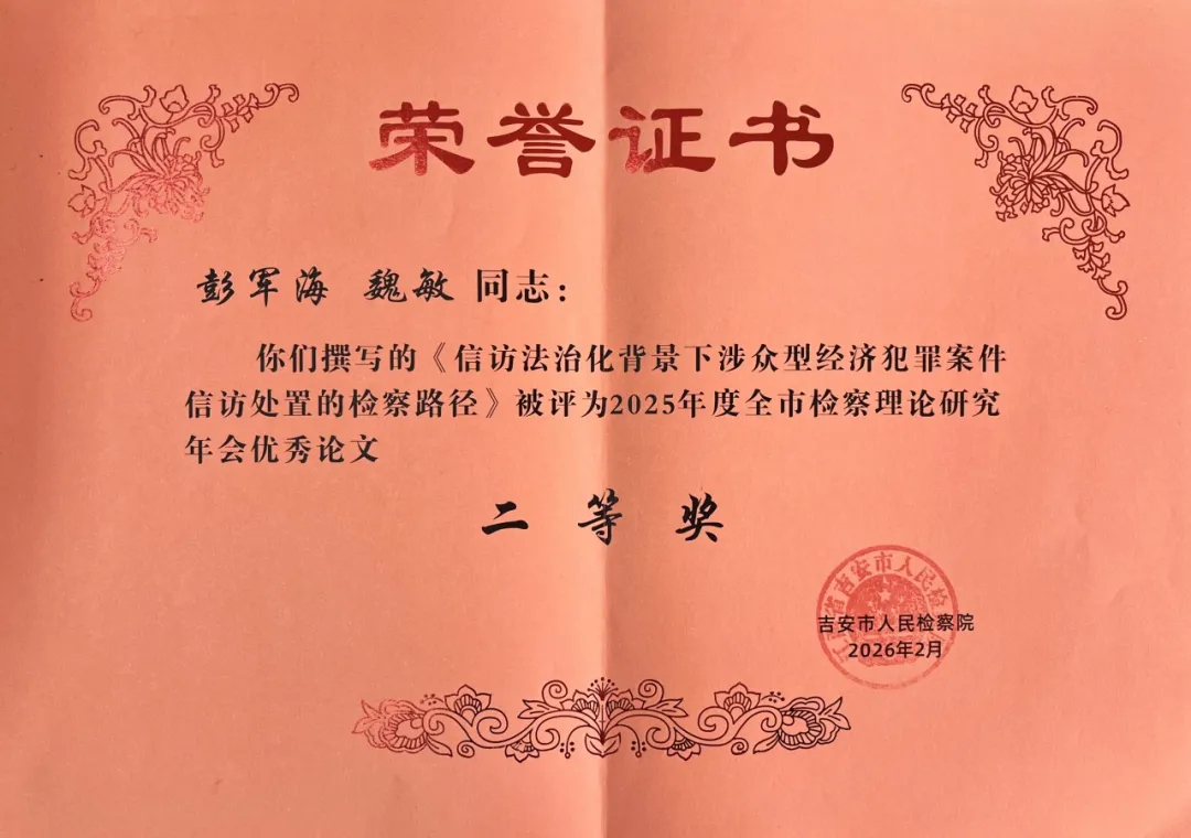 我院干警彭军海、魏敏撰写的《信访法治化背景下涉众型经济犯罪案件信访处置的检察路径》荣获2025年度全市检察理论研究年会优秀论文二等奖。